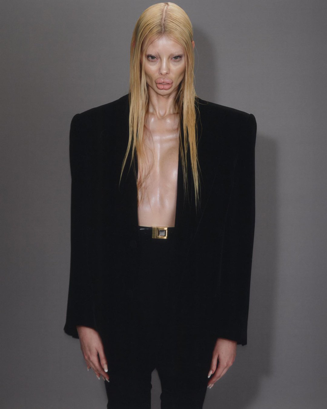 His work with collaborators and in his own editorial output is characterised by gravity-defying spikes, tufts of artificial strands and Beetlejuice bangs. What sets Kamo apart is his exclusive use of synthetic hair, cleverly intertwined with disconcerting CGI editing, such as in HAIRMASTER, or the Y2K cyber nostalgia employed by his musical collaborators.