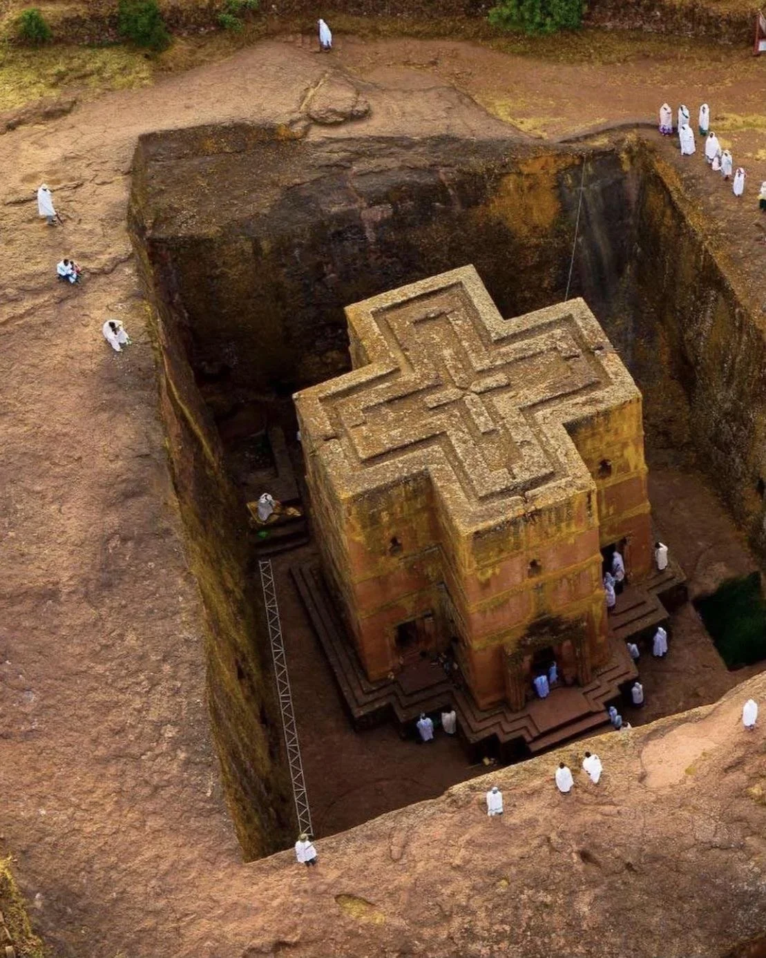 Hewn from a single block of volcanic rock in the shape of a Greek cross, the Church of Saint George stands as a testament to Ethiopia’s medieval architectural prowess. The church was commissioned by King George Meskel Lalibela of the Zagwe dynasty after he had a vision in which one of God’s angels told him of plans to make a building which could bring heaven down to earth. According to legend, upon its completion, these same angels upon the completion of the rock-hewn church visited the site and blessed all those who were present.